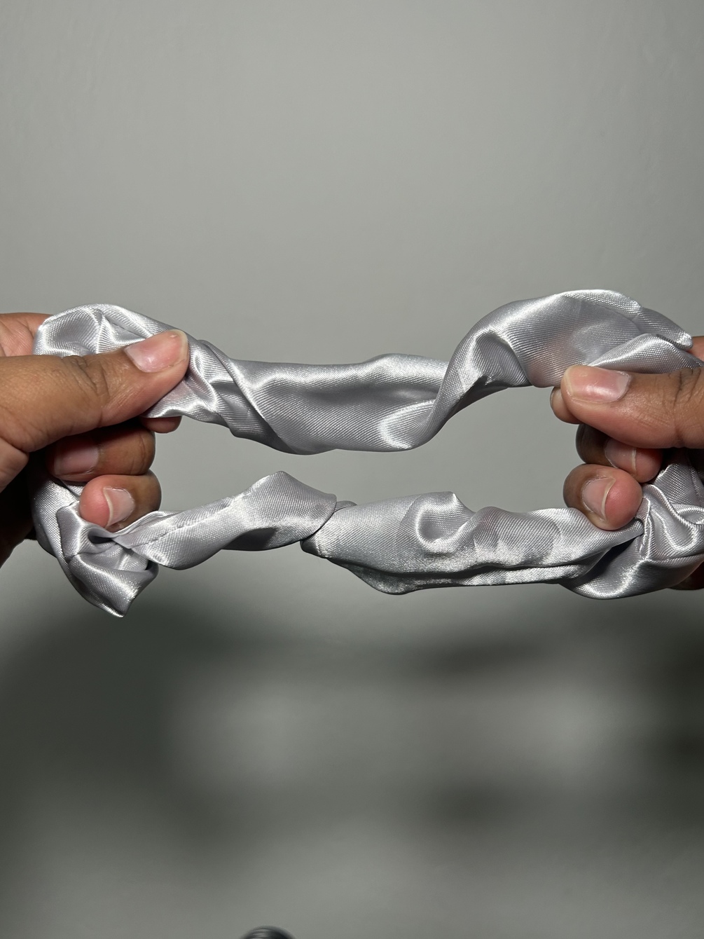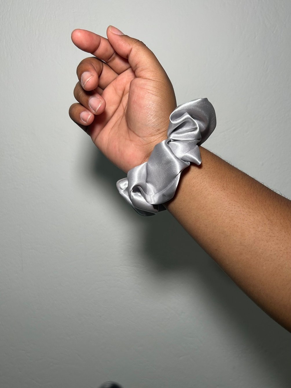 This comfy scrunchie , made from soft satin , brings a touch of calm to your hair game . The gentle grey shade is like a cozy cloud , making it a perfect match for your spring style .